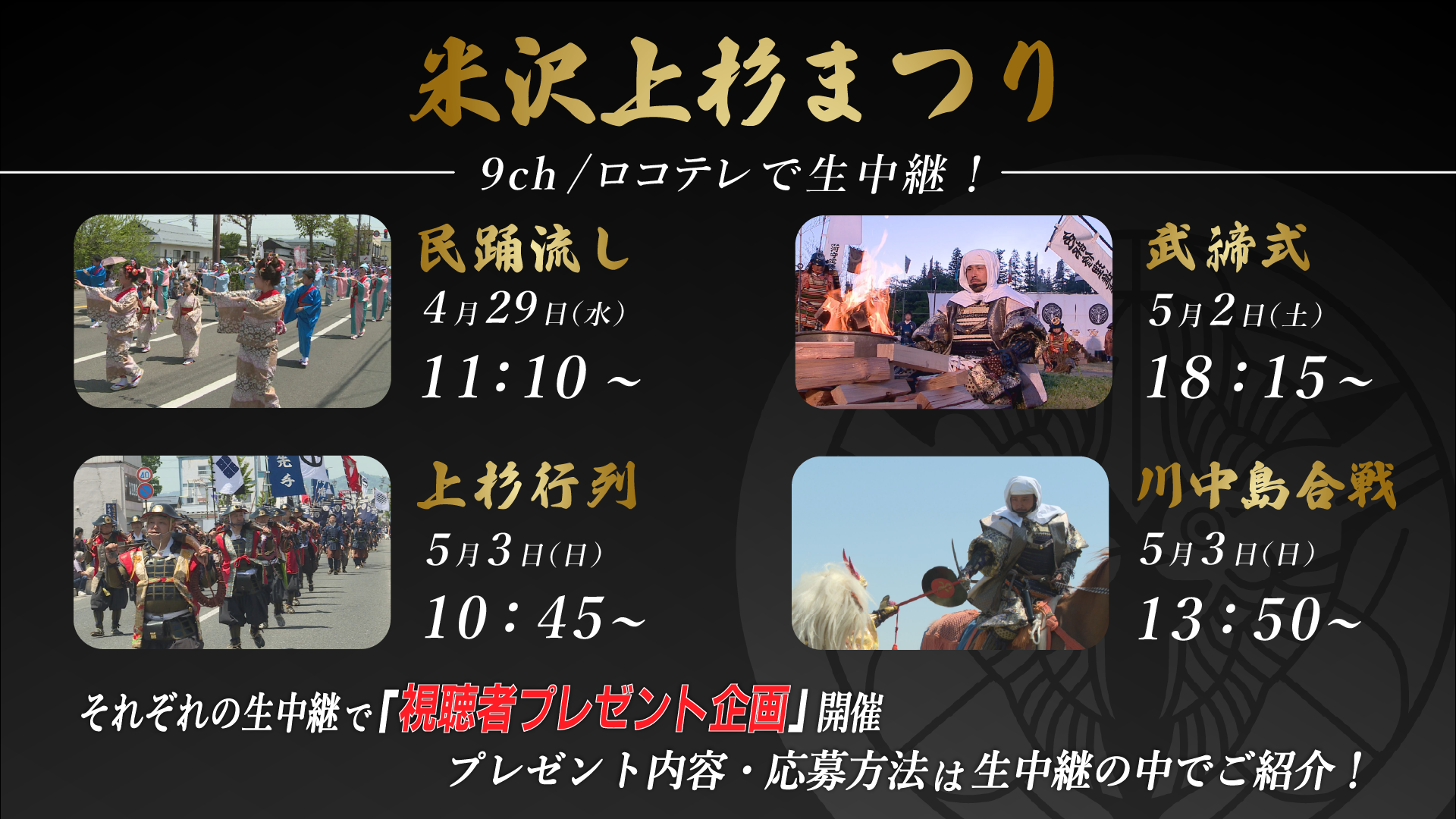 NCVがお届けする4つの生中継(民踊流し・武てい式・上杉行列・川中島合戦)で、それぞれ嬉しいプレゼントが当たる!