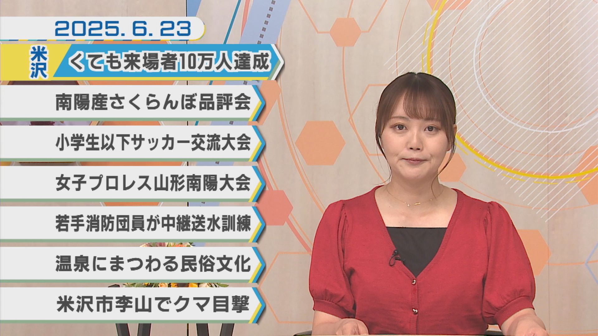6月23日のNEWSラインナップ①「米沢市の屋内遊戯施設くても来場者10万人達成」②「南陽産さくらんぼ品評会」③「米沢フェニックスカップ初開催・小学生以下のサッカー交流大会」④「井上京子選手が地元に凱旋!女子プロレス山形南陽大会」ほか【ミニ企画】FUN!FUN!おきたま「梨郷ヨガサークル」