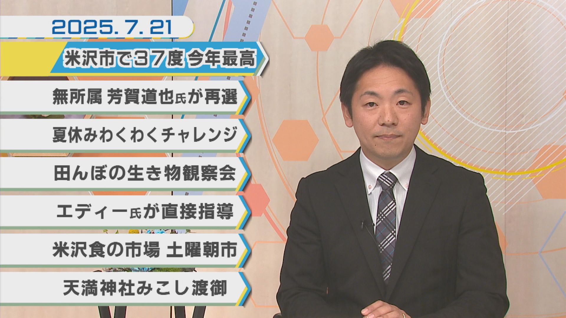 7月21日のNEWSラインナップ①「猛暑!米沢市で今年の最高気温更新」②「参議院選挙山形選挙区・無所属の芳賀道也氏が再選」③「夏休み!わくわくチャレンジ・子どもたちが紙飛行機づくり体験」④「南陽で田んぼの生き物観察会」⑤「ラグビー日本代表ヘッドコーチエディー氏が高畠へ」ほか【ミニ企画】FUN!FUN!おきたま(川西町和太鼓サークル・風きらり)
