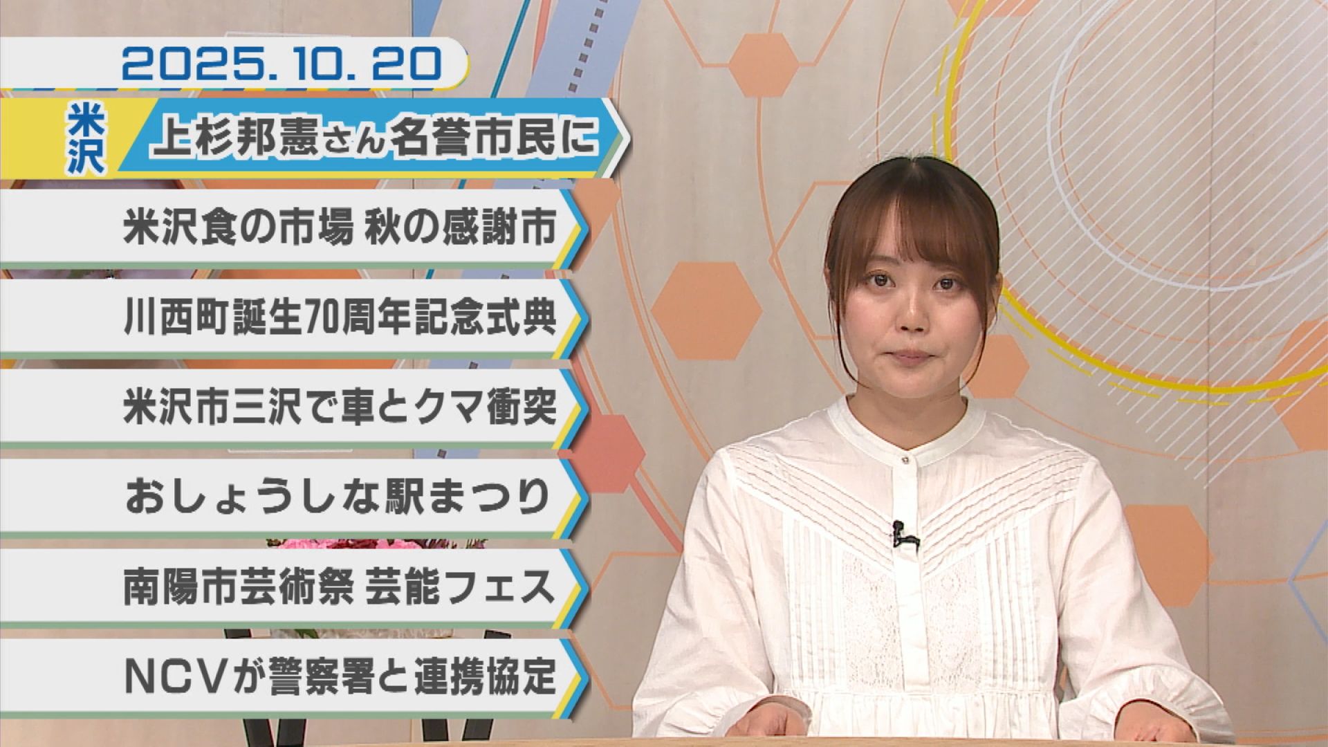 10月20日のNEWSラインナップ①「上杉邦憲さん米沢市名誉市民に」②「米沢食の市場 秋の感謝市」③「川西町誕生70周年記念式典」④「おしょうしな駅まつり」ほか【ミニ企画】FUN!FUN!おきたま・よさこいソーランを踊ろう