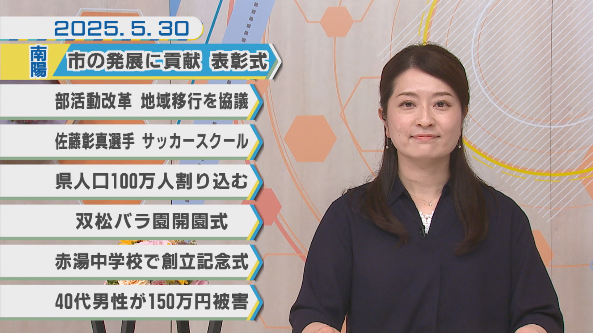 5月30日のNEWSラインナップ①「南陽市の発展などに貢献 消防団など表彰」②「川西町で中学生の部活動改革協議」③「米沢市出身佐藤彰真選手のサッカースクール」④「県人口100万人割れ」」ほか【お隣さん情報】きょう開幕ビアフェスふくしま会場から生中継