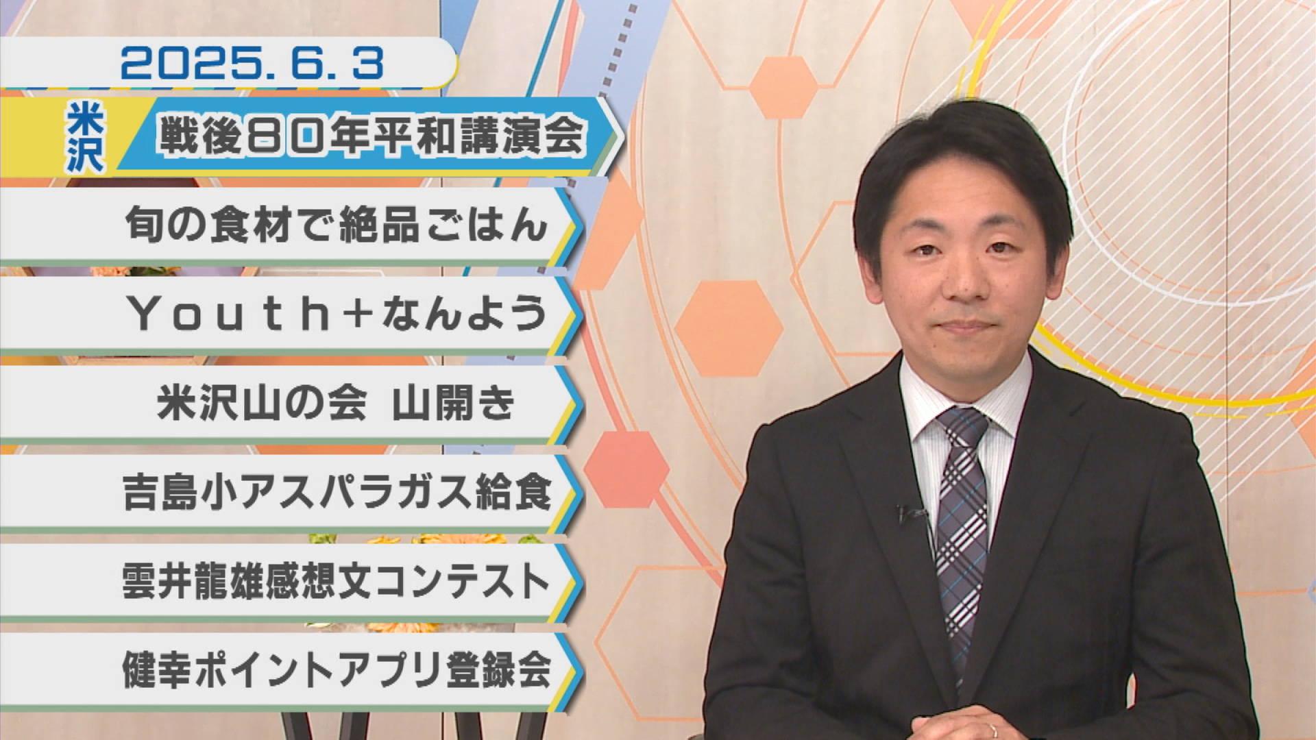 2025.06.04 2025年6月3日Nトピ+プラスNEWS 米沢市 南陽市 川西町 文化 学校 行政 動画 イベント 地域情報 6月3日のNEWSラインナップ①「戦後80年平和講演会」②「旬の食材で絶品ごはん」③「Youth+なんよう」④「米沢山の会 山開き」⑤「吉島小アスパラガス給食」ほか SHARE 2025年6月2日Nトピ+プラスNEWS 2025年6月4日Nトピ+プラスNEWS