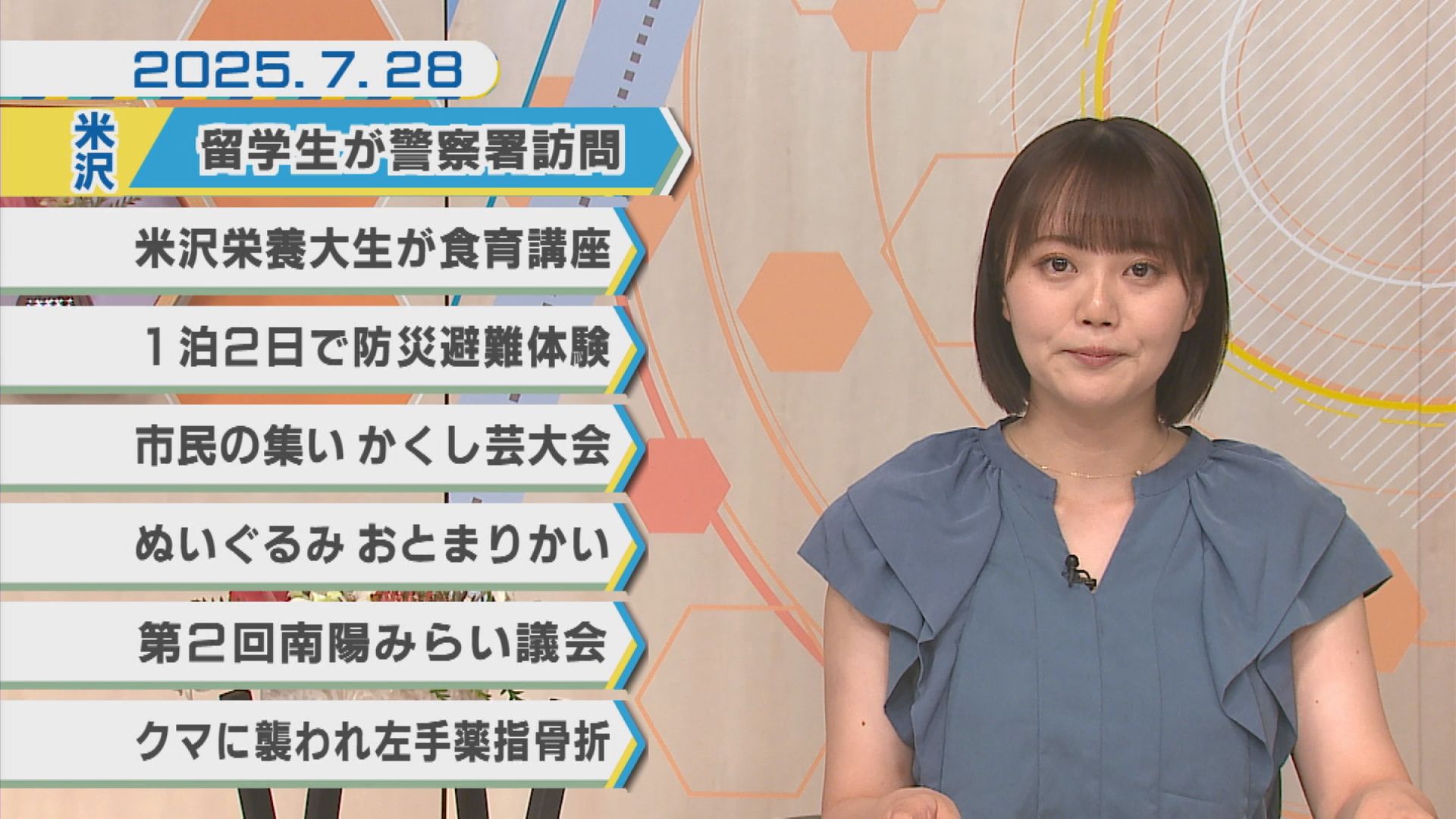 7月28日のNEWSラインナップ①「姉妹都市・アメリカモーゼスレイク市からの短期留学生が米沢警察署を訪問」②「米沢栄養大生がサッカークラブの子供たちに水分補給の大切さ指導」③「米沢市で防災避難体験型キャンプ」④「子供の豊かな想像力育む…ぬいぐるみおとまりかい」ほか【ミニ企画】FUN!FUN!おきたま(南陽ソフトテニススポーツ少年団)