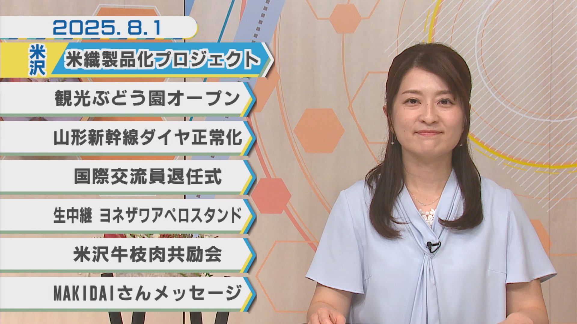 8月1日のNEWSラインナップ①「米織×芸工大…製品化プロジェクト」②「南陽市の観光ぶどう園が一斉オープン」③「米沢市国際交流員退任式」④「生中継!米沢市中心街で開催中の立ち呑みイベント」ほか