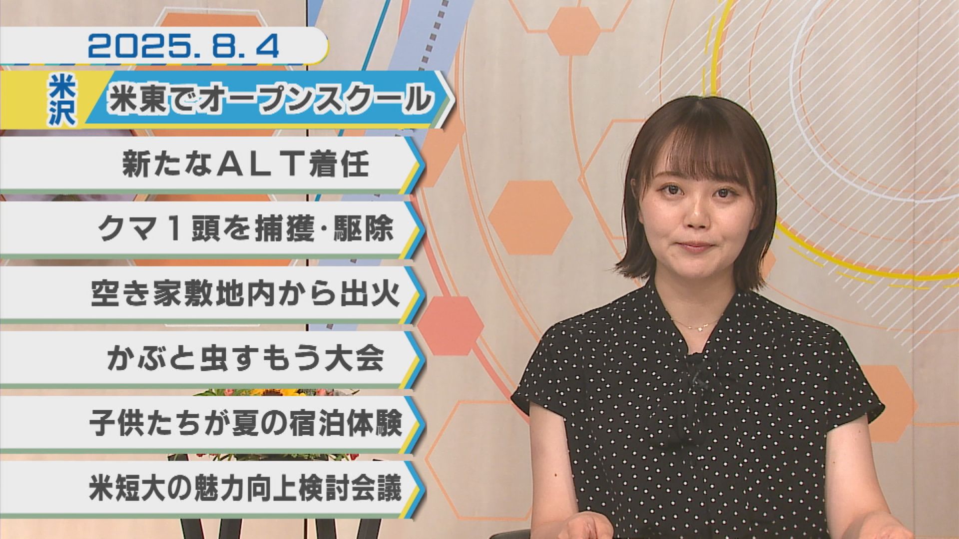 8月4日のNEWSラインナップ①「米沢東高でオープンスクール…中学生が高校の授業体験」②「南陽市に新たな外国語指導助手が着任」③「川西町玉庭でクマ1頭を捕獲・駆除」ほか【ミニ企画】FUN!FUN!おきたま(米沢ダンスコミュニティ・アルメール)