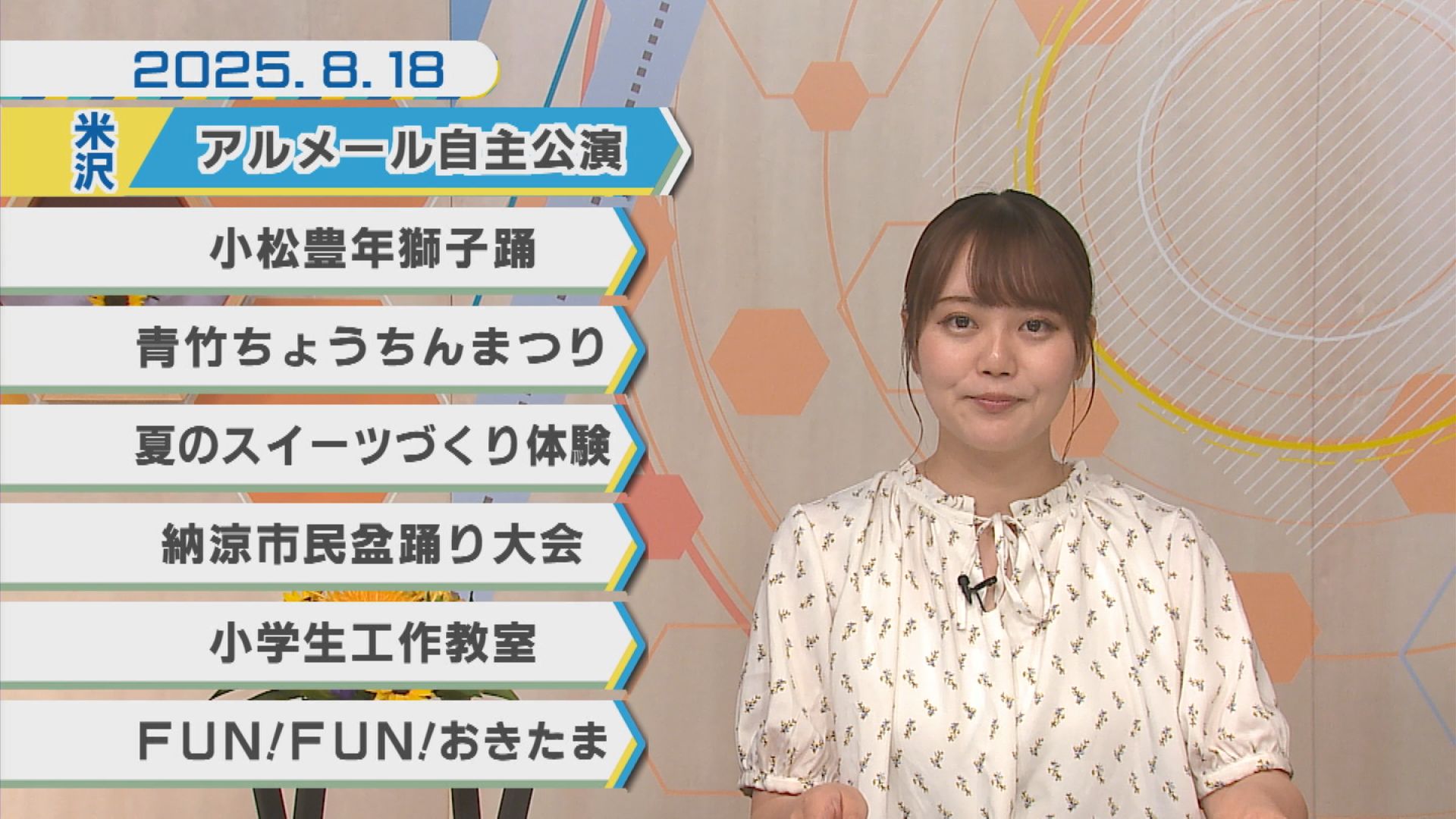 2025.08.19 2025年8月18日Nトピ+プラスNEWS 米沢市 高畠町 川西町 季節 文化 イベント 地域情報 8月18日のNEWSラインナップ①「アルメール自主公演」②「小松豊年獅子踊」③「青竹ちょうちんまつり」④「夏のスイーツづくり」ほか【ミニ企画】FUN!FUN!おきたま「綱木獅子踊り」 SHARE 2025年8月15日Nトピ+プラスNEWS 2025年8月19日Nトピ+プラスNEWS
