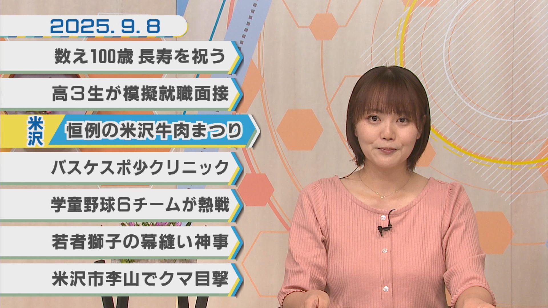 9月8日のNEWSラインナップ①「数え100歳を祝う」②「高校生が模擬就職面接」③「恒例の米沢牛肉まつり」④「若者獅子の幕縫い神事」ほか【ミニ企画】FUN!FUN!おきたま「赤湯小太鼓クラブ」