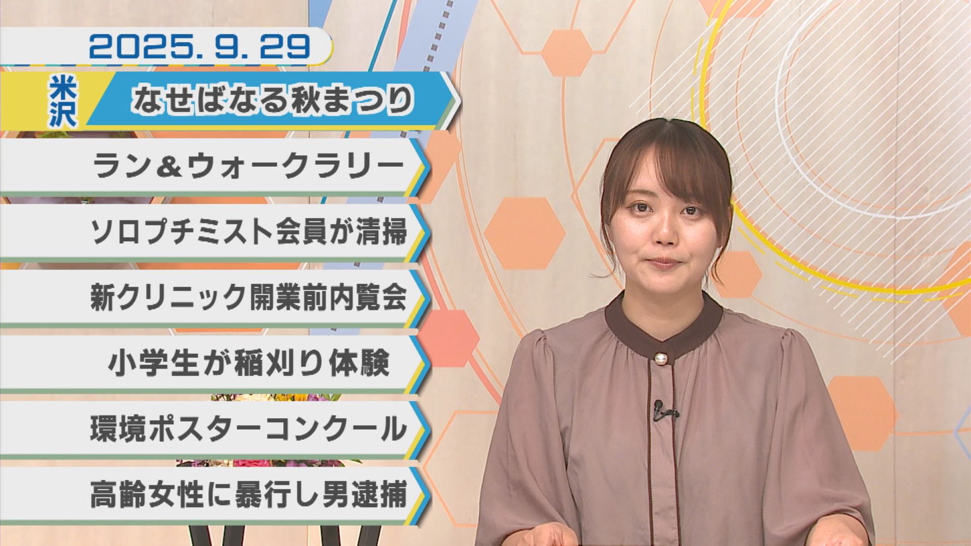 9月29日のNEWSラインナップ①「なせばなる秋まつり」②「ラン&ウォークラリー」③「新クリニック開業前内覧会」④「環境ポスターコンクール」ほか【ミニ企画】FUN!FUN!おきたま「川西・日本舞踊藤柳会」