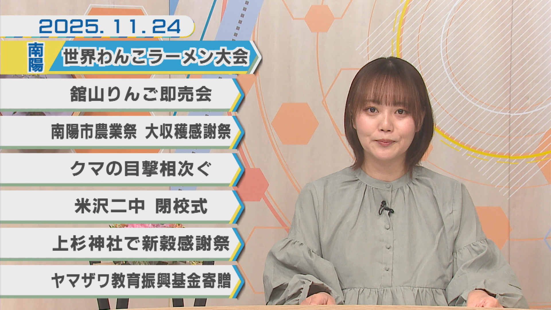 11月24日のNEWSラインナップ①「世界わんこラーメン大会」②「舘山りんご即売会」③「南陽市農業祭 大収穫感謝祭」④「クマの目撃相次ぐ」⑤「米沢二中 閉校式」ほか【ミニ企画】FUN!FUN!おきたま「米南バレーボールクラブ」