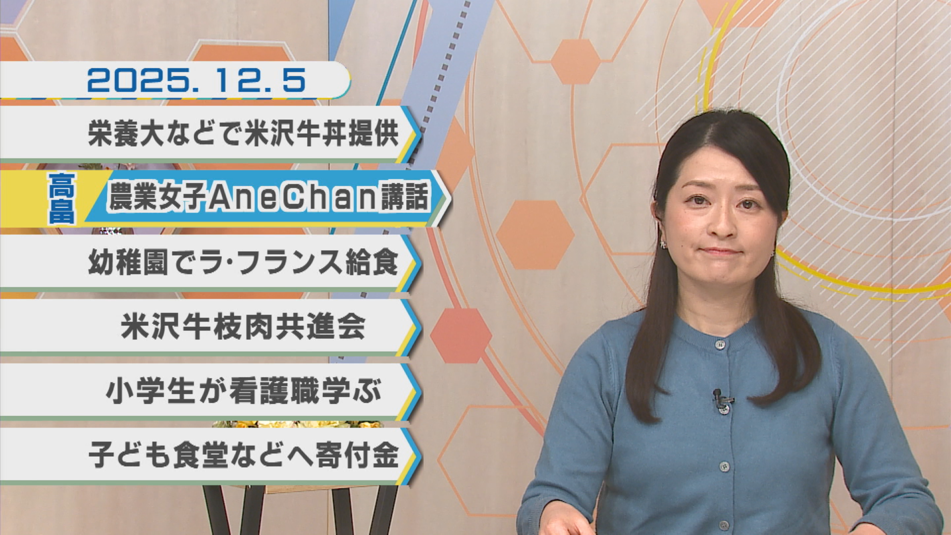12月5日のNEWSラインナップ①「農業女子Anechan講話」②「幼稚園でラ・フランス給食」③「米沢牛枝肉共進会」④「子ども食堂などへ寄付金」ほか【ミニ企画】週末レコメンド・NCV制作のおすすめ番組紹介