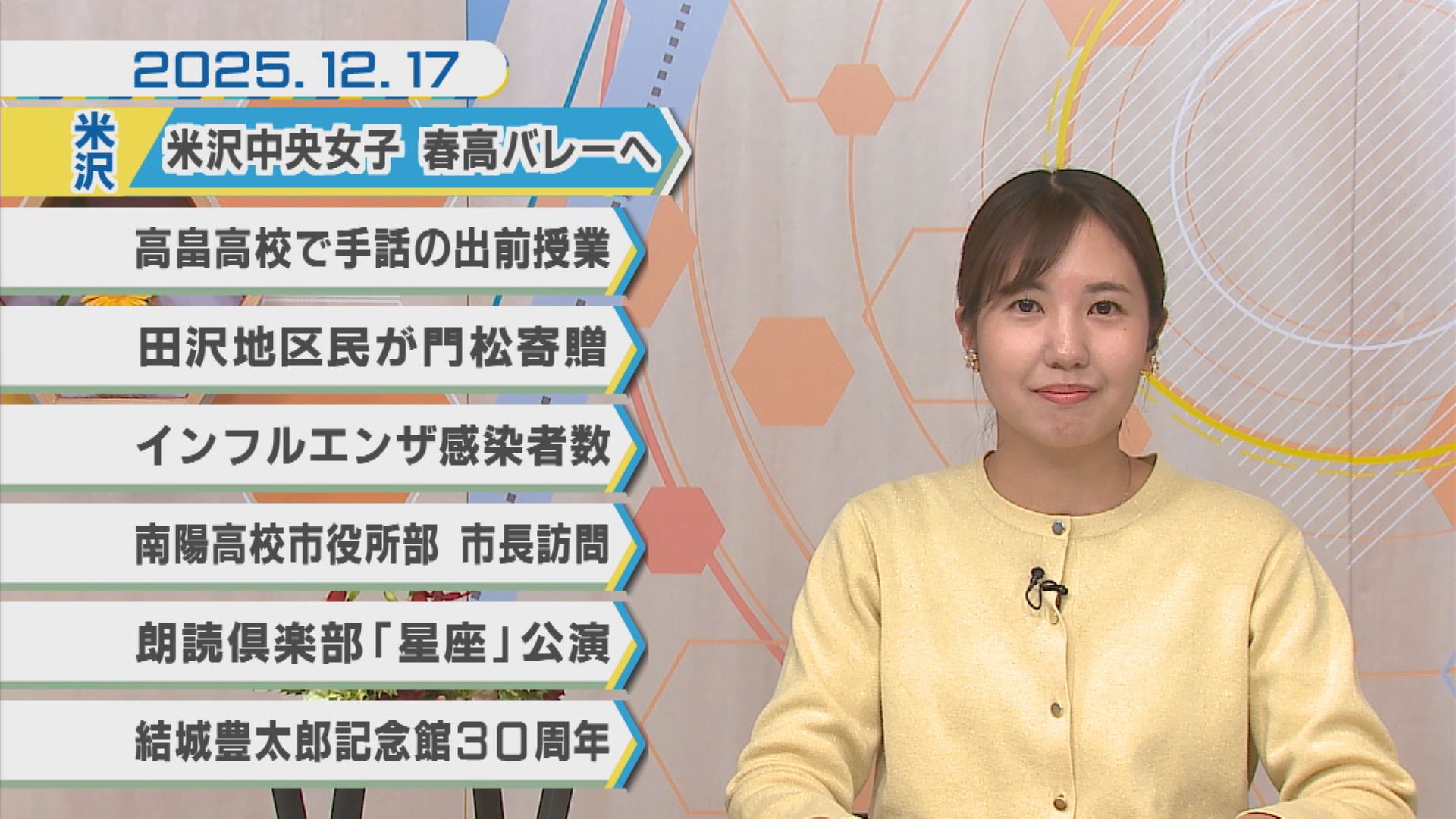 2025.12.18 2025年12月17日Nトピ+プラスNEWS 米沢市 南陽市 高畠町 川西町 季節 文化 学校 行政 地域情報 12月17日のNEWSラインナップ①「米沢中央女子 春高バレーへ」②「高畠高校で手話の出前授業」③「田沢地区民が門松寄贈」④「インフルエンザ感染者数」ほか【ミニ企画】まちスタ南陽 SHARE 2025年12月16日Nトピ+プラスNEWS 2025年12月18日Nトピ+プラスNEWS