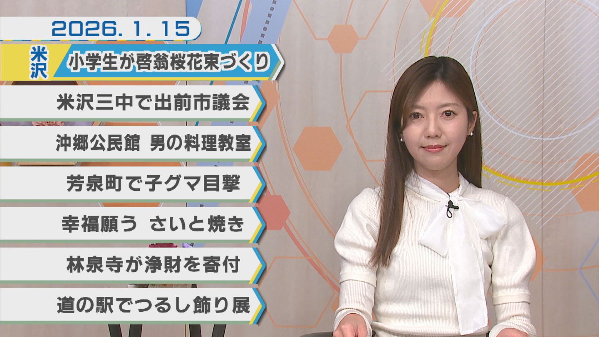 1月15日のNEWSラインナップ①「小学生が啓翁桜花束づくり」②「米沢三中で出前市議会」③「沖郷公民館 男の料理教室」④「芳泉町で子グマ目撃」ほか【ミニ企画】特集・地産地活の人材育成(南陽市出身 池田めぐみさん)