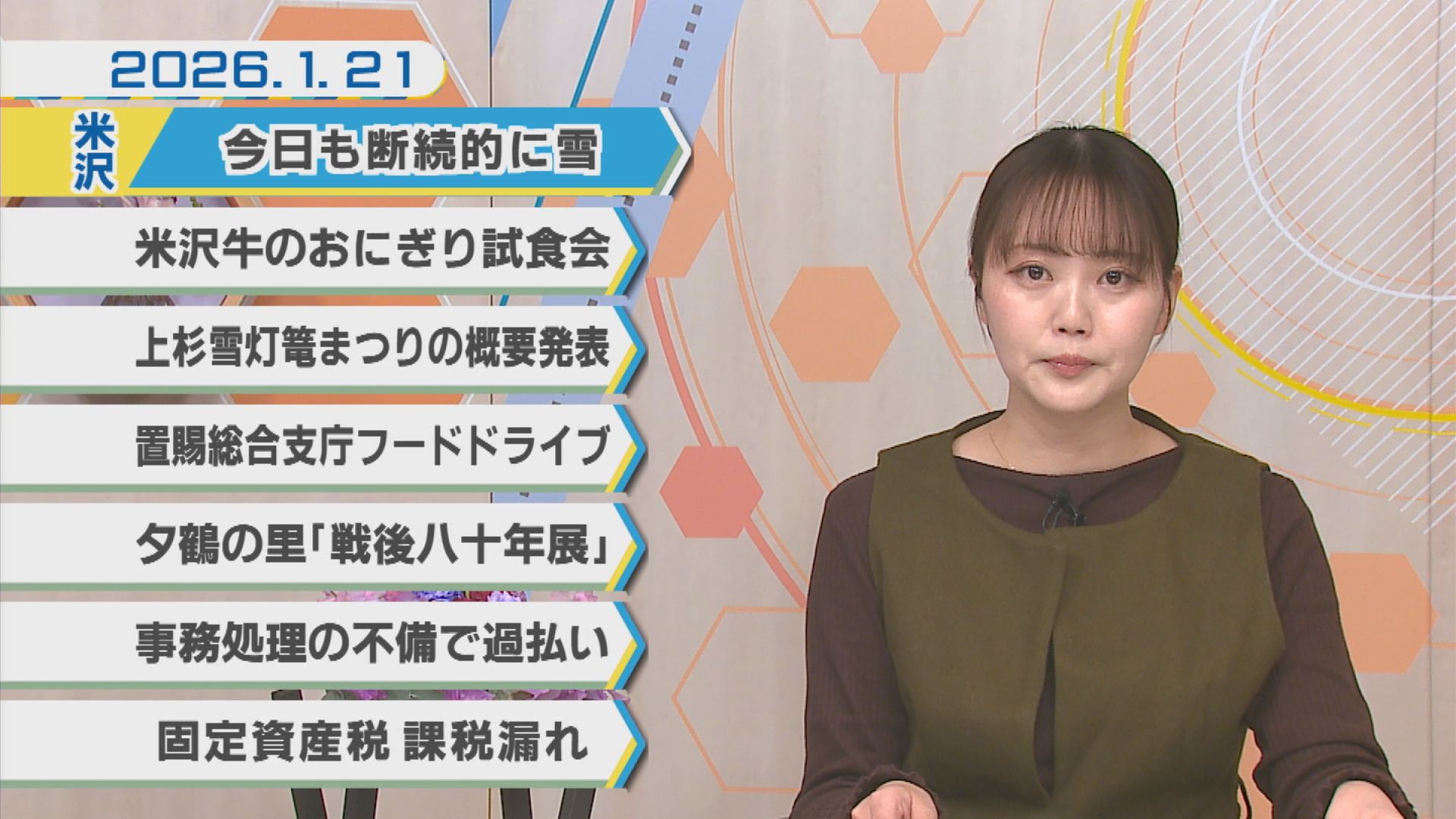 1月21日のNEWSラインナップ①「今日も断続的に雪」②「米沢牛のおにぎり試食会」③「上杉雪灯篭まつりの概要発表」④「置賜総合支庁フードドライブ」⑤「夕鶴の里『戦後八十年展』」ほか【ミニ企画】まちスタ南陽