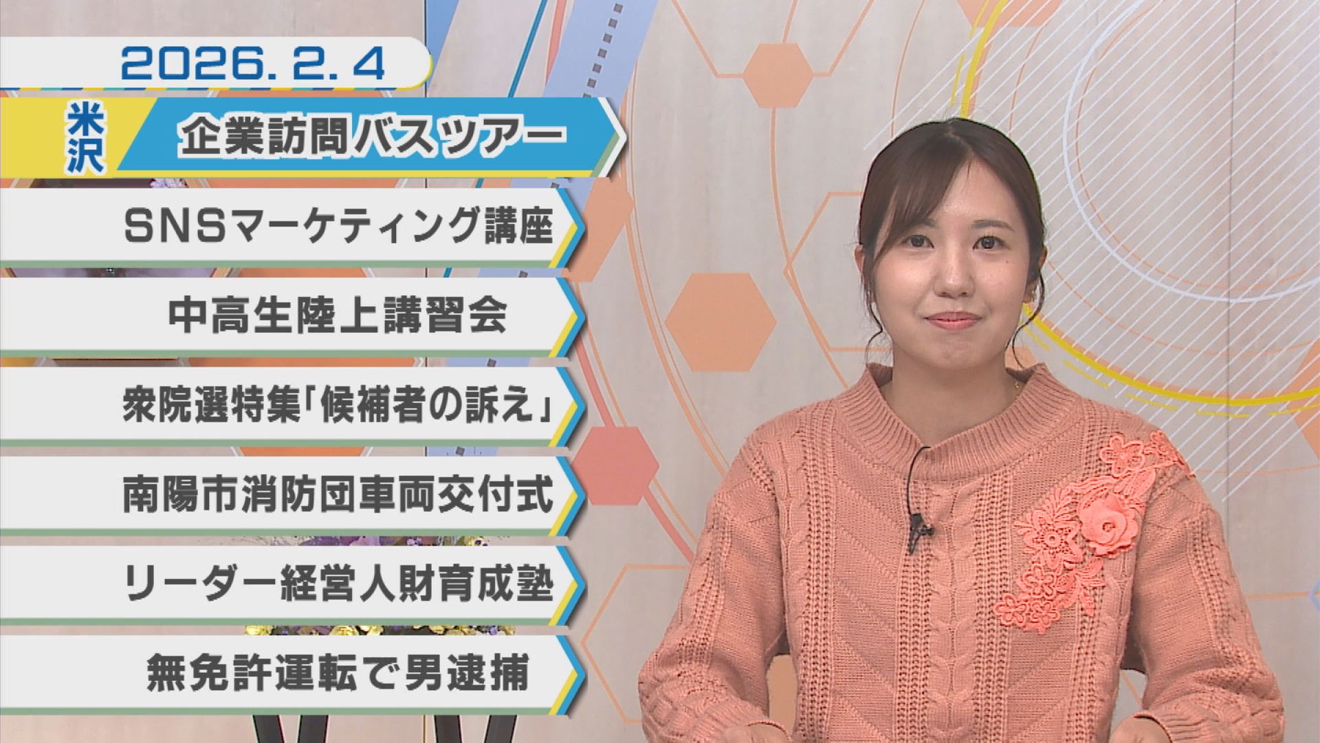 2026.02.05 2026年2月4日Nトピ+プラスNEWS 米沢市 南陽市 高畠町 川西町 学校 行政 動画 スポーツ 地域情報 2月4日のNEWSラインナップ①「企業訪問バスツアー」②「SNSマーケティング講座」③「中高生陸上講習会」④「南陽市消防団車両交付式」ほか【ミニ企画】衆院選候補者の訴え/キラキラ SHARE 2026年2月3日Nトピ+プラスNEWS 2026年2月5日Nトピ+プラスNEWS