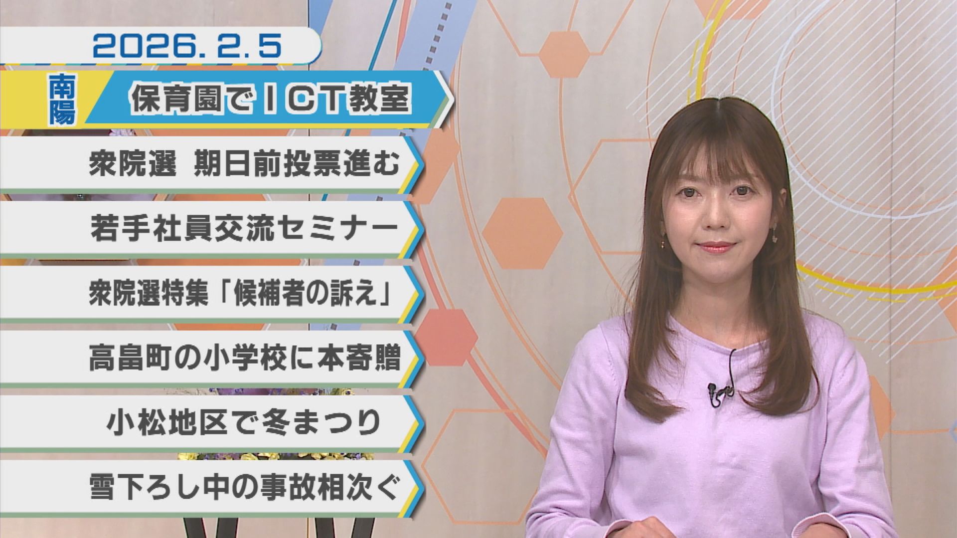 2026.02.06 2026年2月5日Nトピ+プラスNEWS 米沢市 南陽市 高畠町 川西町 行政 イベント 地域情報 2月5日のNEWSラインナップ①「保育園でICT教室」②「衆院選期日前投票進む」③「若手社員交流セミナー」④「高畠町の小学校に本寄贈」ほか【ミニ企画】衆院選候補者の訴え/かわにし日和 SHARE 2026年2月4日Nトピ+プラスNEWS 2026年2月6日Nトピ+プラスNEWS