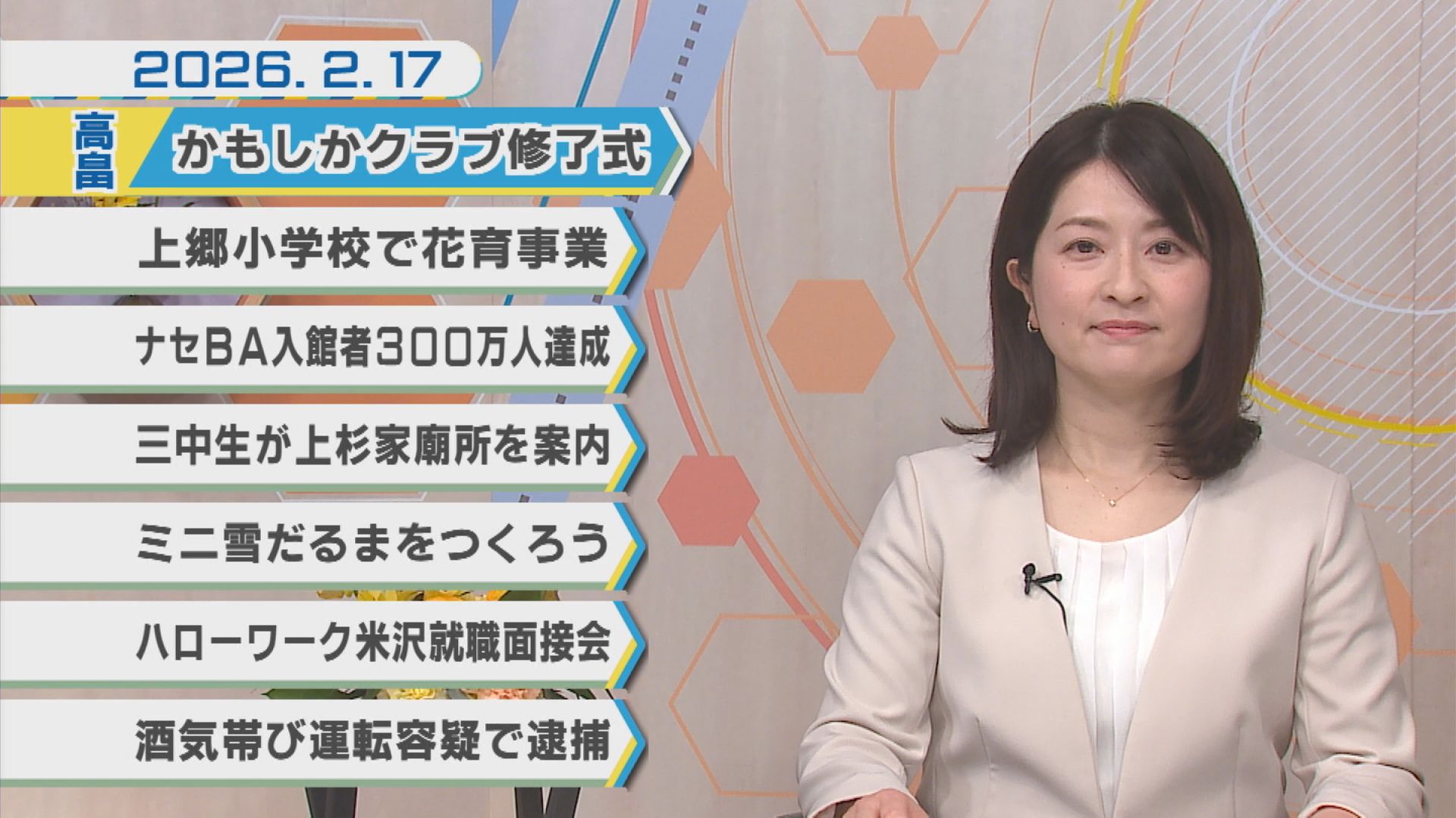 2026.02.18 2026年2月17日Nトピ+プラスNEWS 米沢市 高畠町 季節 学校 動画 イベント 地域情報 2月17日のNEWSラインナップ①「かもしかクラブ修了式」②「上郷小学校で花育事業」③「ナセBA入館者300万人達成」④「ミニ雪だるまをつくろう」ほか【ミニ企画】週末のイベント情報 SHARE 2026年2月16日Nトピ+プラスNEWS 2026年2月18日Nトピ+プラスNEWS