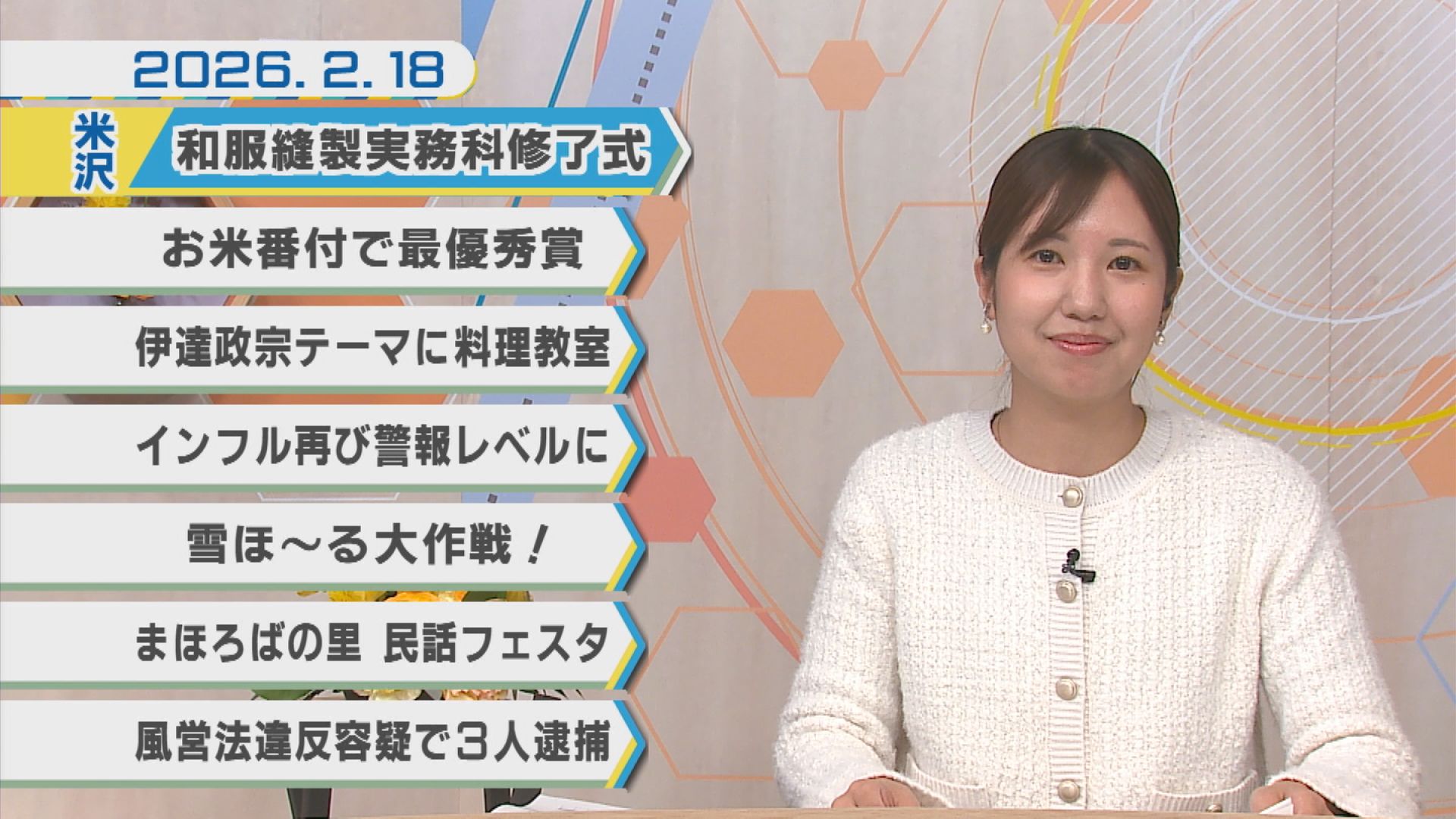 2026.02.19 2026年2月18日Nトピ+プラスNEWS 米沢市 南陽市 高畠町 文化 学校 行政 動画 イベント 地域情報 2月18日のNEWSラインナップ①「和服縫製実務科修了式」②「お米番付で最優秀賞」③「伊達政宗テーマに料理教室」④「インフル再び警報レベルに」ほか【ミニ企画】まちスタ南陽 SHARE 2026年2月17日Nトピ+プラスNEWS