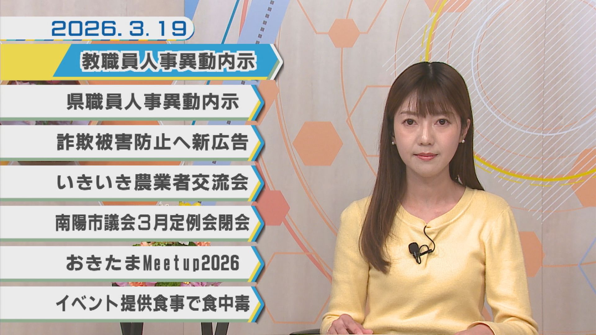 3月19日のNEWSラインナップ①「教職員・県職員人事異動内示」②「ATM詐欺被害防止呼びかけ」③「南陽市議会3月定例会閉会」④「いきいき農業者交流会」【ミニ企画】特集「アートが照らす置賜の未来~アーツミートオキタマ~」など