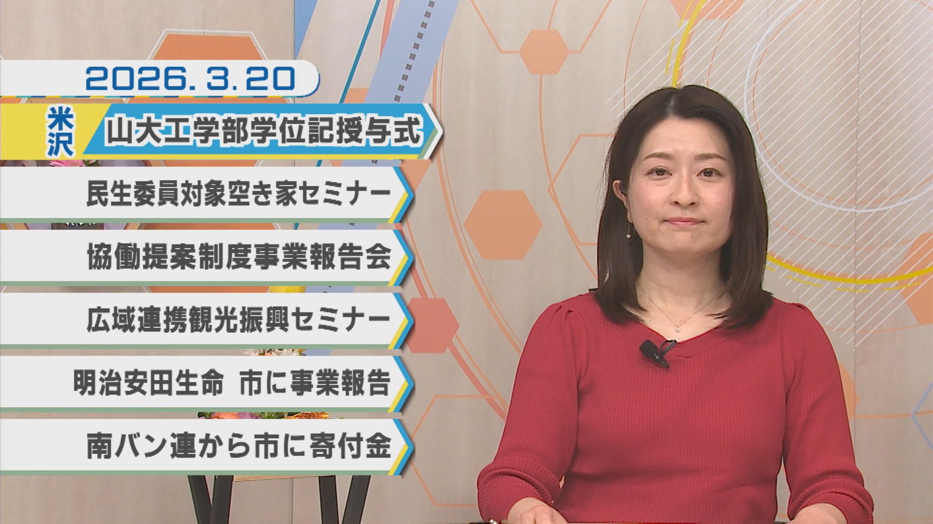 3月20日のNEWSラインナップ①「山形大学工学部学位記授与式」②「民生委員対象空き家セミナー」③「協働提案制度事業報告会」④「広域連携観光振興セミナー」【ミニ企画】NCVサービス紹介・AI搭載玄関カメラについてなど