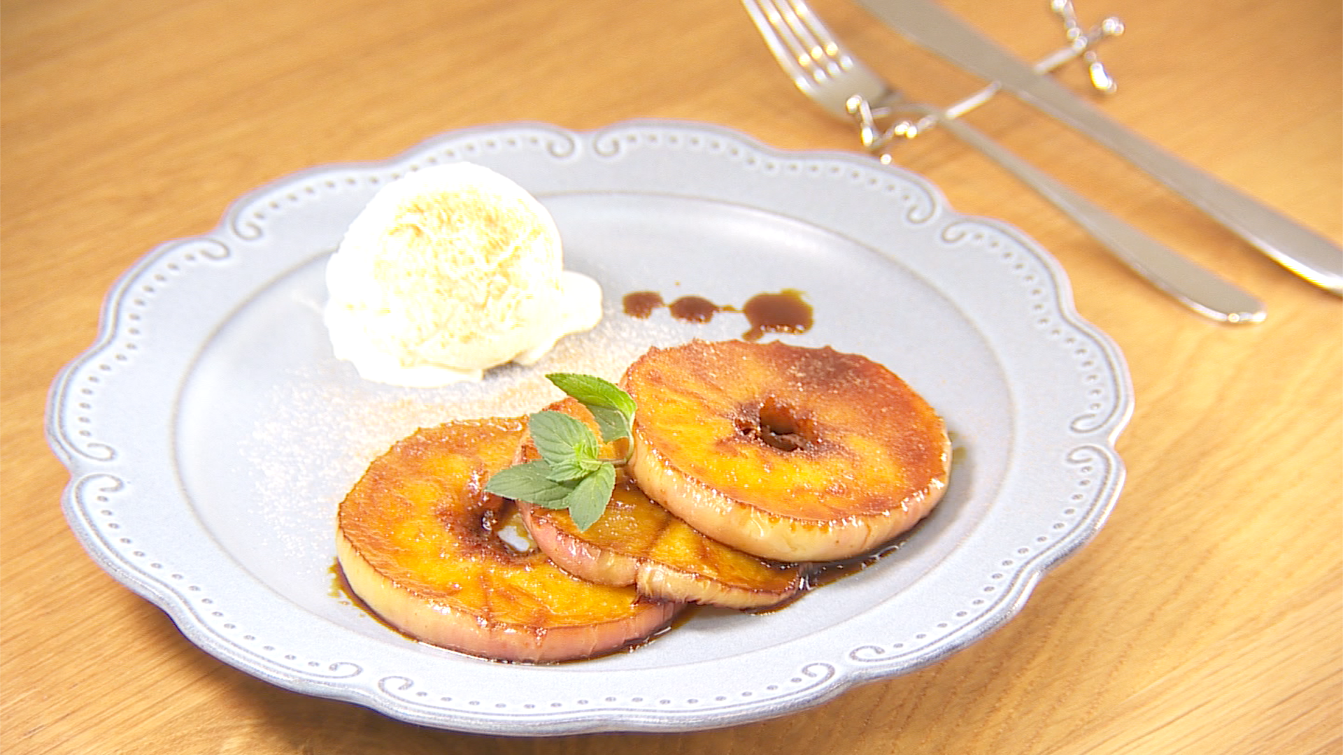⑥ほどよい焼き色がついたら火を止め器に盛りつけ、バニラアイスとミントを飾れば完成。
