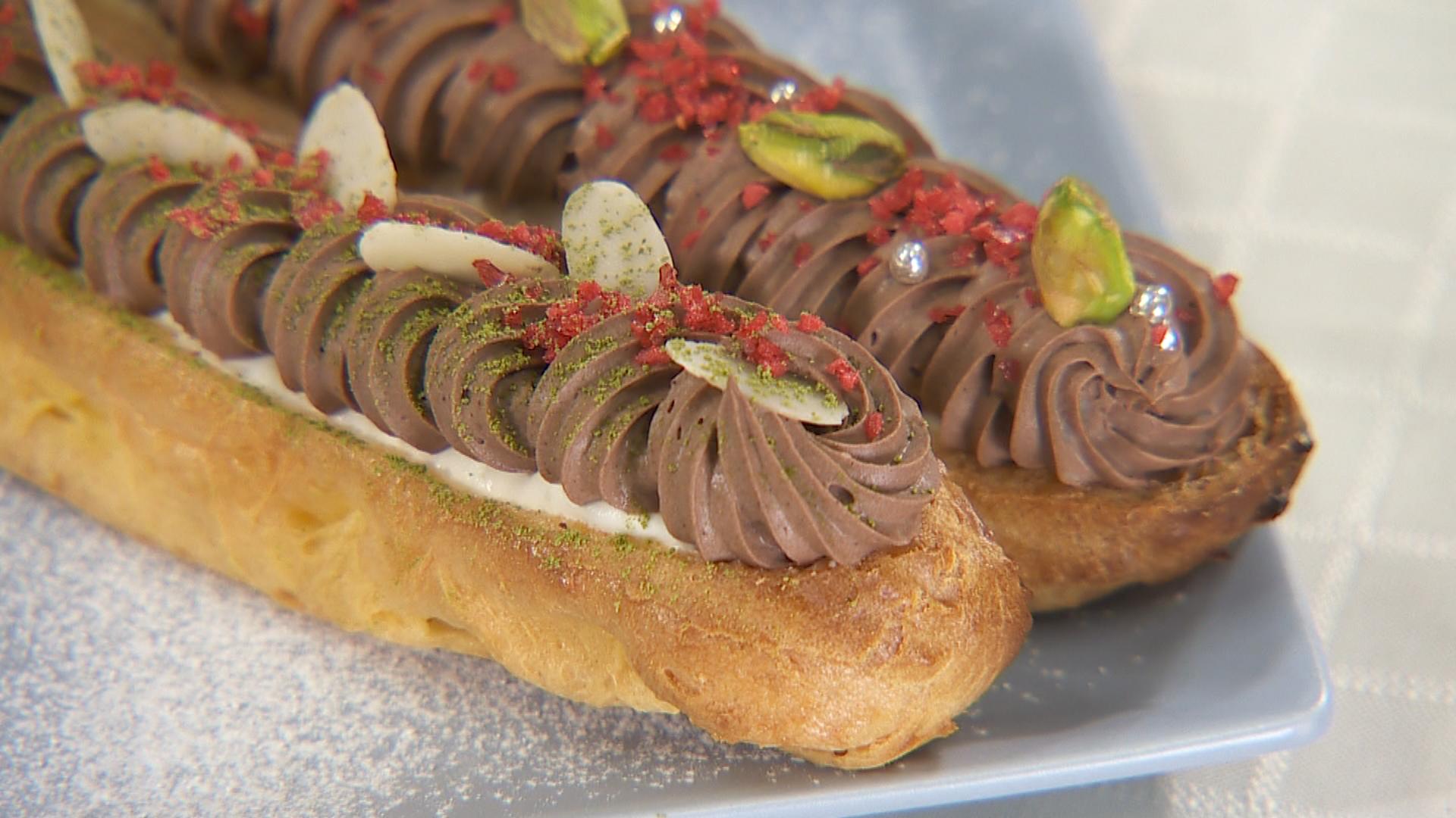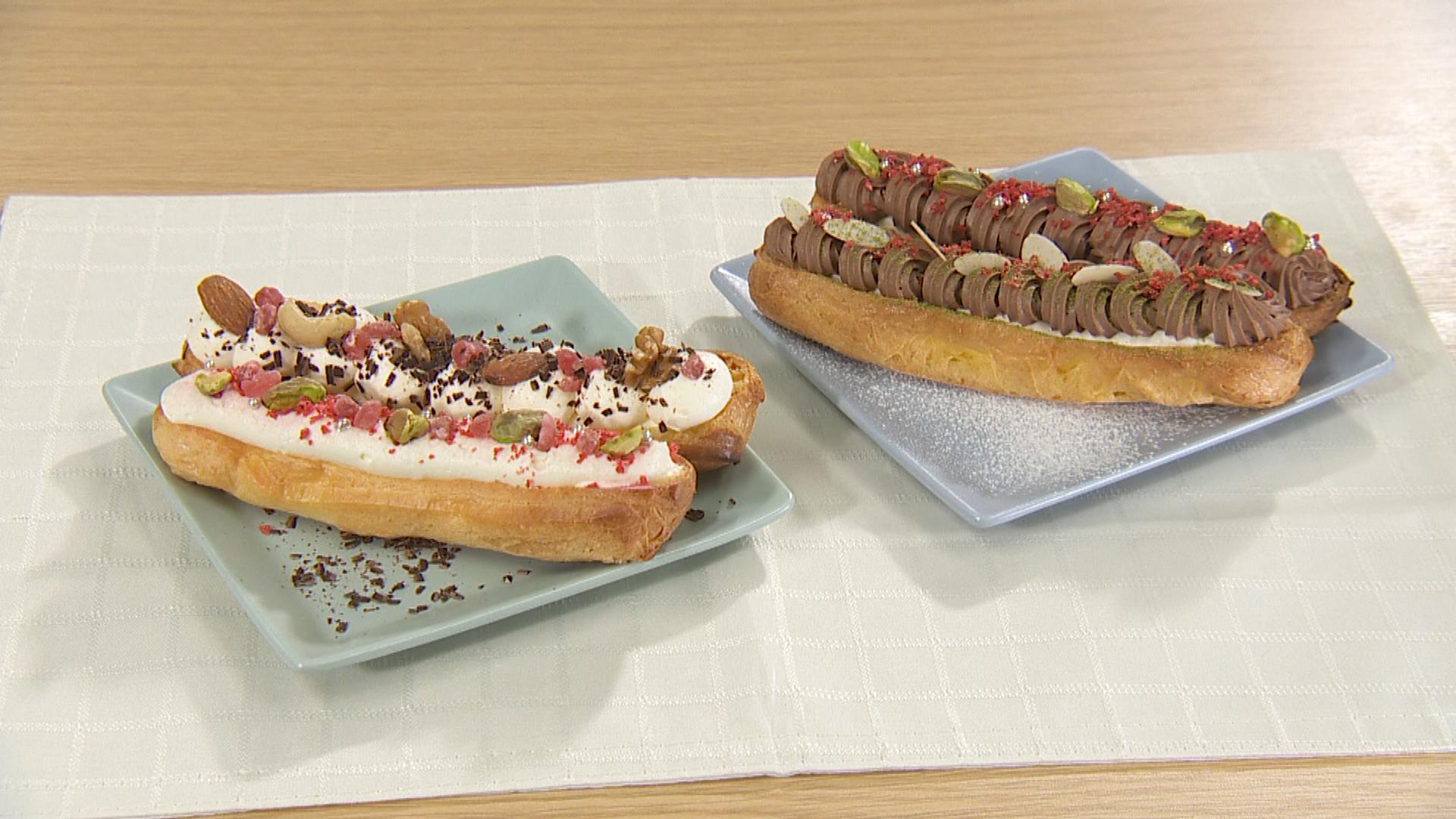 ⑧生地が焼きあがったら横に半分に切り、そのうち5本は生クリームを、残りの5本はココアクリームを絞り、削ったチョコレートやドライフルーツ、アラザン、ナッツなどをトッピングして、粉糖や抹茶を上からかければ完成。