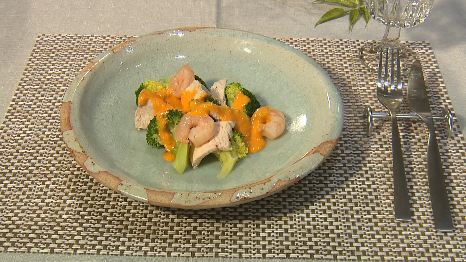 ④ブロッコリー、鶏むね肉、むきエビはそれぞれ茹でで冷ましておく。